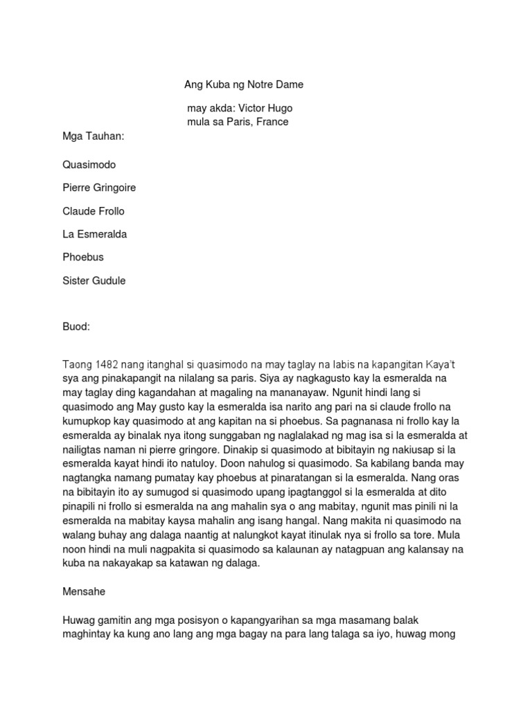Buod ng notre dame. Download View Ang Kuba Ng Notre Dame buod as PDF for free. Ang Kuba ng Notre Dame - bs management accounting - Bmsa 2200 - StuDocu lectures ang kuba ng notre dame buod ni victor hugo isinalin sa filipino ni willita enrijo sa isang malawak na espasyo ng katedral ang mamamayan upang magsaya Sign inRegister Sign inRegister Home My Library Courses You dont have any courses yet. Ang Kuba Ng Notre Dame Buod Ng Nobela Ni Victor Hugo ANG KUBA NG NOTRE DAME Sa paksang ito ating babasahin ng nobela na.