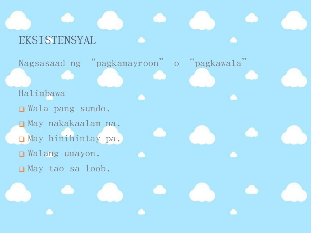 Ang paksang pangungusap ay ang pangunahing paksa o diwa ng isang pangungusap. MGA PANGUNGUSAP NA WALANG PAKSA. Nagsasaad ng kalagayan o panahong.