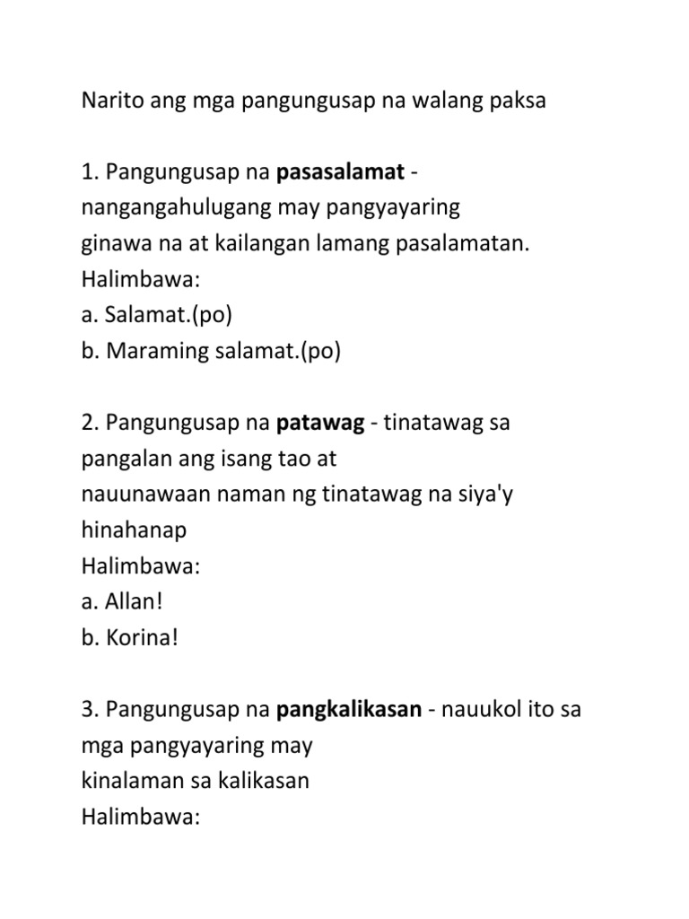 Lipon ng mga salita na walang paksa o panaguri at hindi nagsasaad ng buong diwa. Pangungusap na walang paksa by julie4ann4cruz. PANGUNGUSAP NA WALANG PAKSA PANGUNGUSAPSentence Ang tawag natin sa lipon ng mga salitang nagpapahayag ng buong diwa.