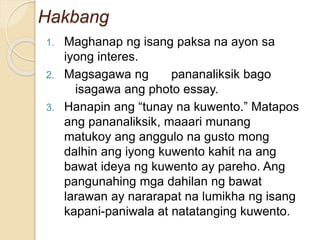 Mga Dapat Tandaan sa Pagsulat Larawang-Sanaysay. 1 ng isang paksa ayon sa iyong interes. PICTORIAL ESSAY LARAWANG-SANAYSAY Mga tinipong larawan na isinaayos nang may wastong pagkakasunod-sunod ng mga pangyayari upang maglahad ng.