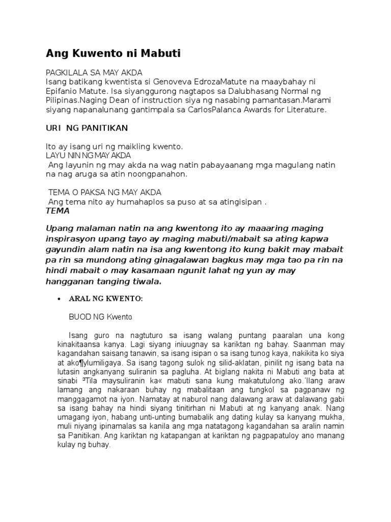 Community content is available. Ang maikling kwentong Kuwento ni Mabuti ay isinulat ni Genoveva Edroza- Matute. Rename Tema Edit Iyon lamang nakararanas ng mga lihim na kalungkutan ang nakakikilala sa lihim na kaligayahan.