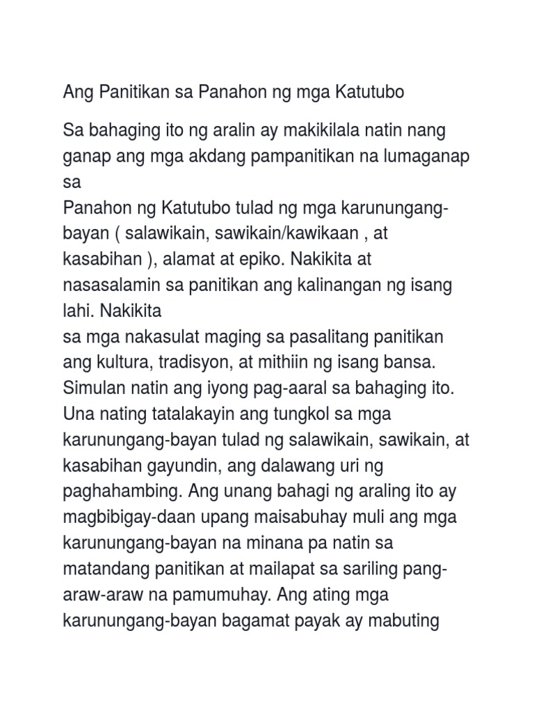 Samakatuwid hindi natin dapat ipagwalang-bahala at ibaon sa limot ang mga karunungang-bayan ng ating panitikan. ANYO NG PANITIKAN SA PANAHON NG MGA KATUTUBO 2. March 12 2013.