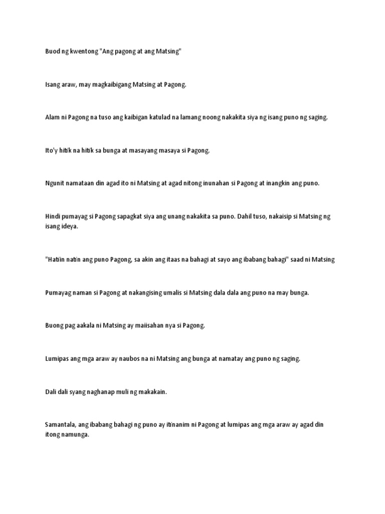 Kinain niya lahat ng bunga ng puno. Kagaya Mo Rin Ako 2. Sina Pagong at Matsing ay matalik na magkaibigan.