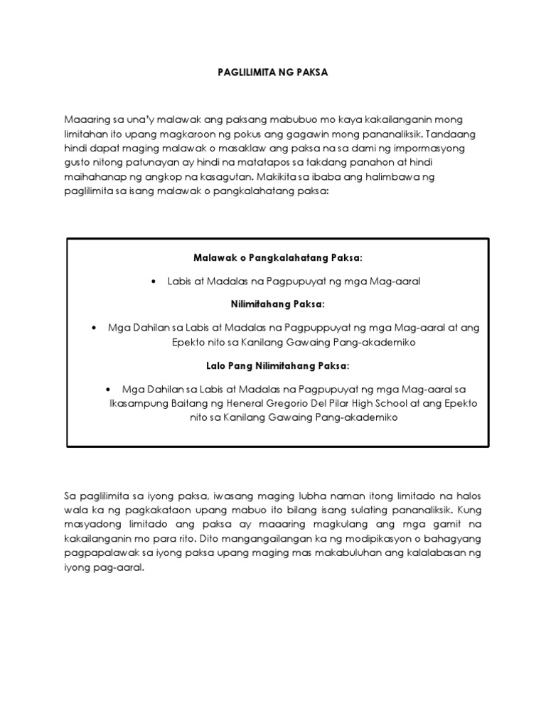 MGA HANGUAN NG PAKSA. Ito ay dahil halos lahat ng mga katanungan mo tungkol sa kahit anong paksa ay. Paglilimita ng Paksa sa Pananaliksik 1.