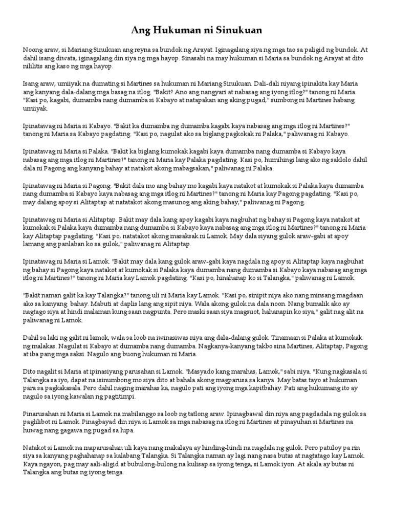 Nang makita niya ang kasakiman at kasamaan ng mga taong naninirahan dito nagpasiya siya. HUKUMAN NI MARIANG SINUKUAN Pabula Isinalin bilang Maikling Dula NI eddie lauyan de fiesta esteban Ang Hukuman ni Mariang Sinukuan ay isang Kwentong Bayang nagpapaliwanag ng. Ang kawalan ng pagkakaisa ng mga hayop.