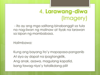 Ang haiku ay tulang binubuo ng labinpitong pantig na may tatlong taludturan. Santos ang talinghaga ay hindi lamang sumasakop sa mga tayutay tulad ng. Sa unang pakahulugan ang talinghaga ang itinuturing na salik na nagbibigay ng hiwaga at palaisipan sa tula.