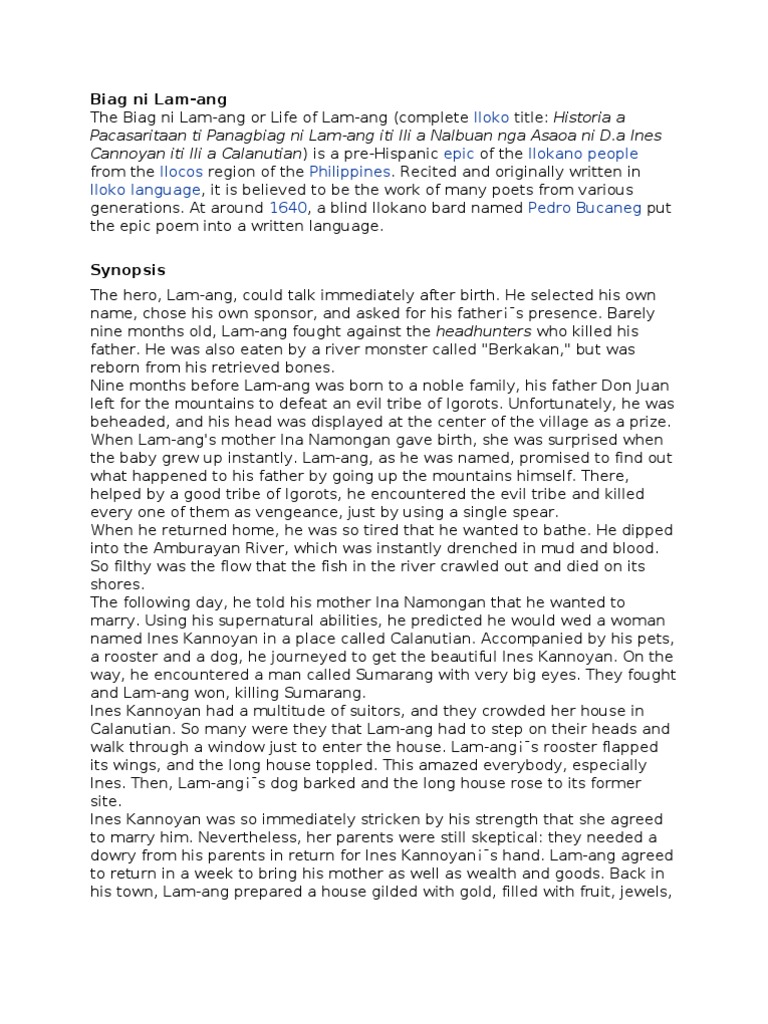 Buhay ni Lam-ang BIAG NI LAM-ANG Life of Lam-ang is a pre-Hispanic epic poem of the Ilocano people of the Philippines. Ang Buhay Ni Lam-Ang Siyam na buwan bago siya isinilang sa isang maharlikang familia namundok ang kanyang ama upang sugpuin ang isang masamang pangkat ng mga Igorot. Doteng hinihingi ng magulang ni Ines.