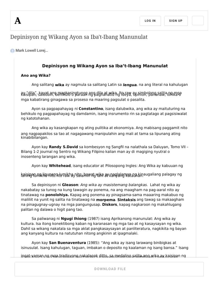 Doc Depinisyon Ng Wikang Ayon Sa Iba T Ibang Manunulat Mark Lowell Lorejas Academia Edu Pdf