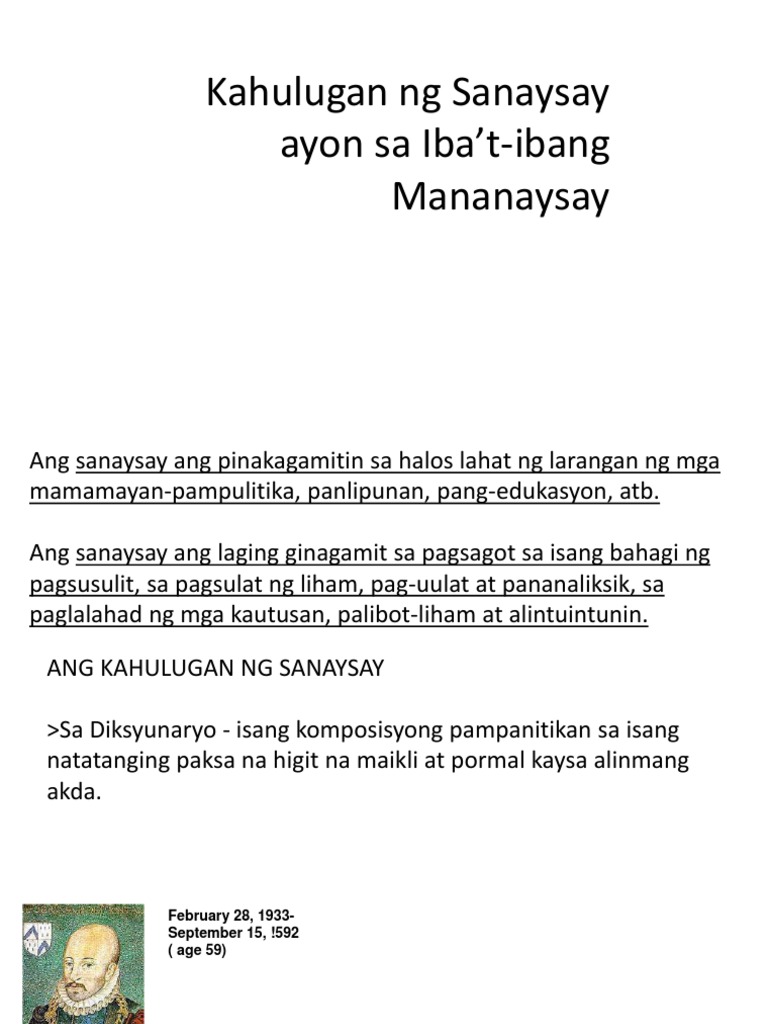 Mga Bahagi ng Sanaysay. Ito ay may layuning mapalawak ang kaalaman hinggil sa iba-ibang. SANAYSAY - Sa paksang ito malalaman nation ang kahulugan ng sanaysay ang kanyang dalawang uri at ang tatlong ibat ibang mga bahagi nito.