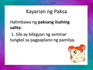 Ang paksa o tinatawag ding simuno ay ang subject sa wikang Ingles. Ito ang pinag-uusapan o pinagtutuunan ng pansin sa isang pangungusap. Pagsasanay sa Filipino -.
