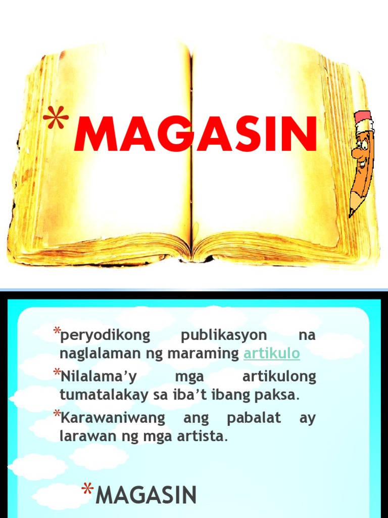 May mga gurong nagbibigay ng mga paksang maaaring pagpilian ng mga mag-aaral. Magasin Isang uri ng popular na babasahin na naglalaman ng ibat-ibang paksa at kadalasang inilalabas sa isang tiyak na araw o panahon.