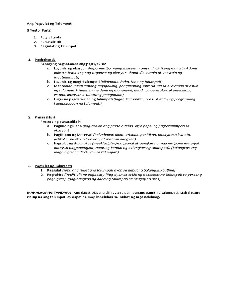 Ang gawaing pampaaralan ay iwan natin sa paaralan. Talumpati Isang pormal na pahayag ss harap ng publiko at pormal na pagtalakay ng isang paksa para sa mga tagapakinig Talumpati Isang paraan ng pagpapahayag ng saloobin kaisipan at damdamin sa isang masining na pamamaraan. Okasyon Mahalagang isaalang-alang ang okasyon sa paksa ng talumpati na bibigkasin sapagkat hindi magiging makabuluhan ang lahat ng pagsusumikap ng tagapagsalita na mapaganda ang kanyang talumpati kung hindi naman.