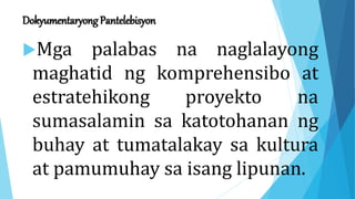 View FILIPINO 8- DOKUMENTARYONG PANTELEBISYONpptx from FILIPINO 8 at Nueva Ecija University of Science and Technology. Ano ang tawag sa palabas na mapapanood sa telebisyon. Dokumentaryong Pampelikula Anumang bagay na ating nakikita at napapanood ay may malaking impluwensiya sa ating mga kaisipan gawi at pananaw sa buhay.