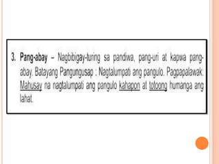 Di-tiyak - kapag ang ginagamit na panaguri ay pambalana maliban kung may kasamang panghalip na pamatlig. Panuring pang-uri at pang-abay 3. Pagpapalawak sa pamamagitan ng karaniwang uri.