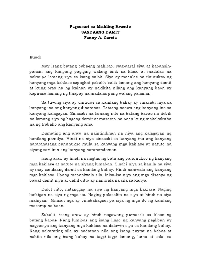 Sandaang damit maikling kwento buod. View sandaang damitdocx from EDU 1003 at St. Ito ay tungkol sa isang batang babae na kapos sa buhay. Ang maikling kwento ay isang akdang pampanitikang likha ng guniguni at salagimsim na salig sa.