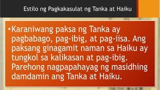 TANKA haiku Katangi-tangi Buhos pa ulan Ikaw at ikaw lamang Ikaw ang magpatighaw Aliw ng puso Puso kong lumbay. Bayan kong mahal Buhay ay ibibigay Iyan ay tunay 2. Ang tanka ay may limang taludtod na may kabuuang 31 na pantig.